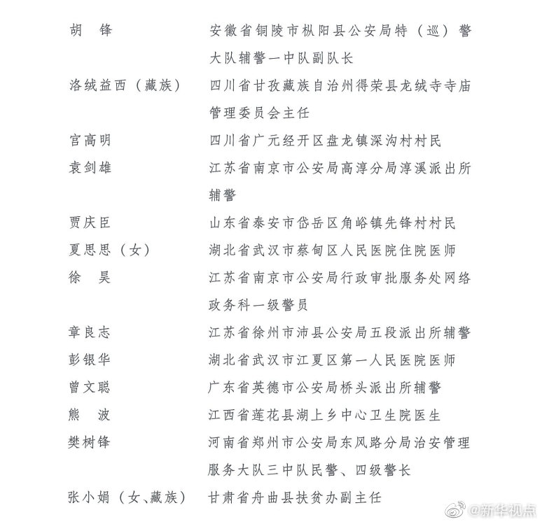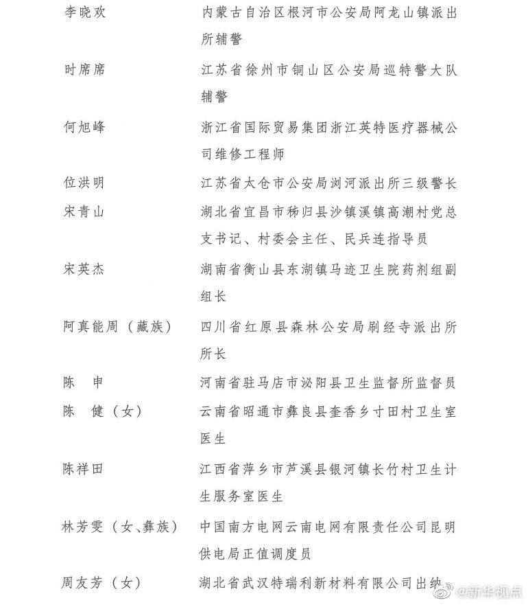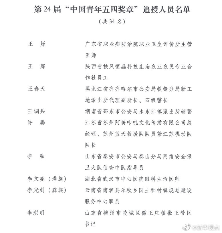 第24屆“中國青年五四獎(jiǎng)?wù)隆弊肥谌藛T分別是:廣東省職業(yè)病防治院職業(yè)衛(wèi)生評價(jià)所主管醫(yī)師王爍,陜西省扶風(fēng)恒盛科技生態(tài)農(nóng)業(yè)農(nóng)民專業(yè)合作社員工王輝,黑龍江省齊齊哈爾市公安局鐵鋒分局新工地派出所代理副所長、四級(jí)警長王春天,湖南省邵東市公安局水東江鎮(zhèn)派出所輔警王調(diào)兵,江蘇省蘇州阿美咔嘰文化傳播有限公司總經(jīng)理、蘇州藍(lán)天救援隊(duì)隊(duì)員兼江蘇機(jī)動(dòng)隊(duì)隊(duì)長許鵬,山東省泰安市公安局泰山分局網(wǎng)絡(luò)安全保衛(wèi)大隊(duì)偵查中隊(duì)指導(dǎo)員李弦,湖北省武漢市中心醫(yī)院眼科主治醫(yī)師李文亮(滿族),云南省南澗縣樂秋鄉(xiāng)國土和村鎮(zhèn)規(guī)劃建設(shè)服務(wù)中心職員李光劍(彝族),山東省德州市陵城區(qū)徽王莊鎮(zhèn)徽王管區(qū)書記李洪明,內(nèi)蒙古自治區(qū)根河市公安局阿龍山鎮(zhèn)派出所輔警李曉歡,江蘇省徐州市銅山區(qū)公安局巡特警大隊(duì)輔警時(shí)席席,浙江省國際貿(mào)易集團(tuán)浙江英特醫(yī)療器械公司維修工程師何旭峰,江蘇省太倉市公安局瀏河派出所三級(jí)警長位洪明,湖北省宜昌市秭歸縣沙鎮(zhèn)溪鎮(zhèn)高潮村黨總支書記、村委會(huì)主任、民兵連指導(dǎo)員宋青山,湖南省衡山縣東湖鎮(zhèn)馬跡衛(wèi)生院藥劑組副組長宋英杰,四川省紅原縣森林公安局刷經(jīng)寺派出所所長阿真能周(藏族),河南省駐馬店市泌陽縣衛(wèi)生監(jiān)督所監(jiān)督員陳申,云南省昭通市彝良縣奎香鄉(xiāng)寸田村衛(wèi)生室醫(yī)生陳健(女),江西省萍鄉(xiāng)市蘆溪縣銀河鎮(zhèn)長竹村衛(wèi)生計(jì)生服務(wù)室醫(yī)生陳祥田,中國南方電網(wǎng)云南電網(wǎng)有限責(zé)任公司昆明供電局正值調(diào)度員林芳雯(女、彝族),湖北省武漢特瑞利新材料有限公司出納周友芳(女),安徽省銅陵市樅陽縣公安局特(巡)警大隊(duì)輔警一中隊(duì)副隊(duì)長胡鋒,四川省甘孜藏族自治州得榮縣龍絨寺寺廟管理委員會(huì)主任洛絨益西(藏族),四川省廣元經(jīng)開區(qū)盤龍鎮(zhèn)深溝村村民宮高明,江蘇省南京市公安局高淳分局淳溪派出所輔警袁劍雄,山東省泰安市岱岳區(qū)角峪鎮(zhèn)先鋒村村民賈慶臣,湖北省武漢市蔡甸區(qū)人民醫(yī)院住院醫(yī)師夏思思(女),江蘇省南京市公安局行政審批服務(wù)處網(wǎng)絡(luò)政務(wù)科一級(jí)警員徐昊,江蘇省徐州市沛縣公安局五段派出所輔警章良志,湖北省武漢市江夏區(qū)第一人民醫(yī)院醫(yī)師彭銀華,廣東省英德市公安局橋頭派出所輔警曾文聰,江西省蓮花縣湖上鄉(xiāng)中心衛(wèi)生院醫(yī)生熊波,河南省鄭州市公安局東風(fēng)路分局治安管理服務(wù)大隊(duì)三中隊(duì)民警、四級(jí)警長樊樹鋒,甘肅省舟曲縣扶貧辦副主任張小娟(女、藏族)。