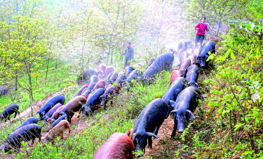 4月28日,周紅珍(右)與哥哥一起趕著母豬和豬崽上山。