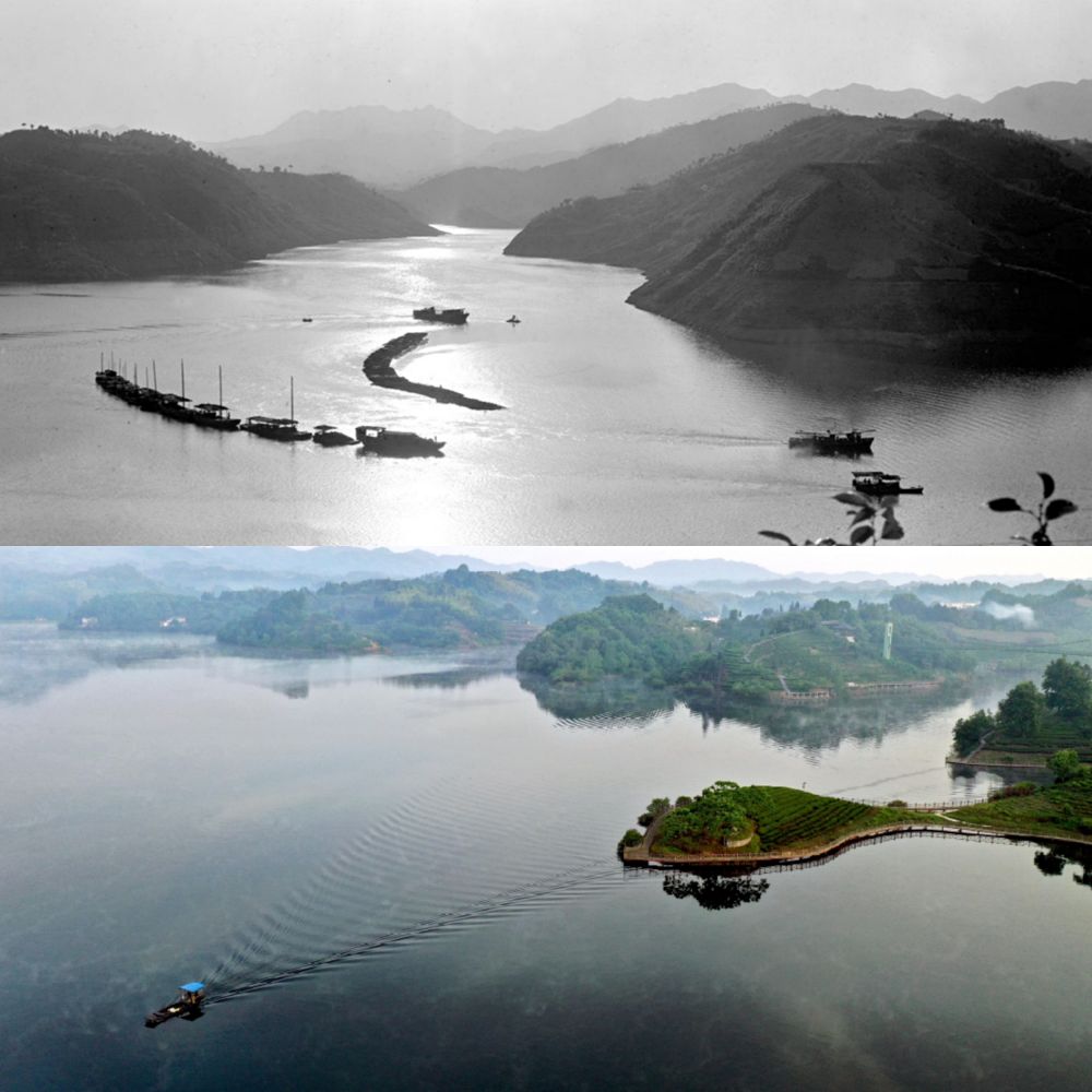 ?。ㄉ蠄D:1976年金寨的水庫(kù),新華社記者成大林?jǐn)z;下圖:2019年水庫(kù)之上是茶谷。新華社記者陶明攝)