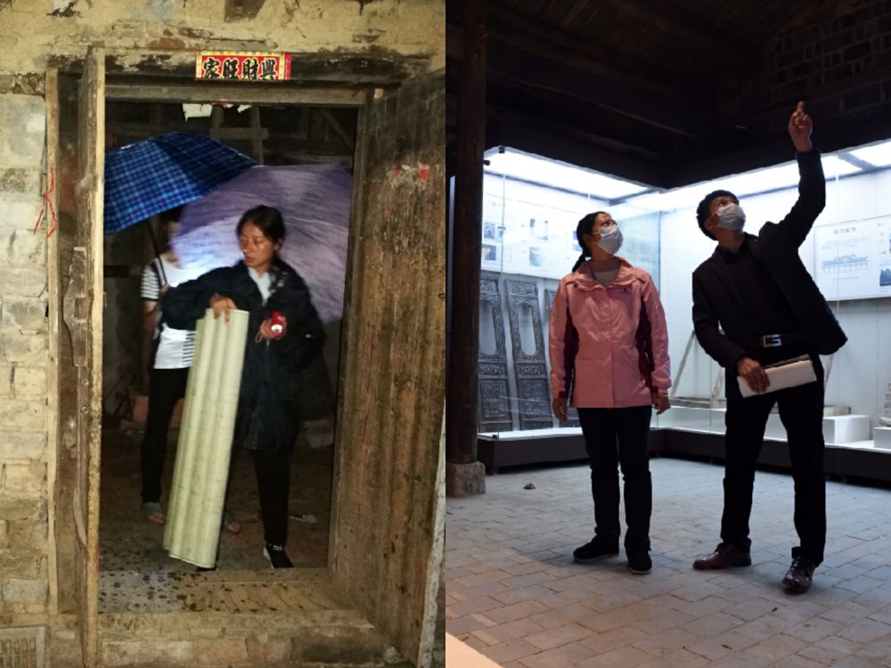 ?。ㄗ髨D:2017年7月的一場(chǎng)大暴雨中,大灣村第一書記余靜轉(zhuǎn)移危房中群眾,新華社記者陳諾攝;右圖:2020年3月19日,大灣村在建農(nóng)俗博物館內(nèi),余靜(左)和施工人員交流。新華社發(fā)周牧攝)