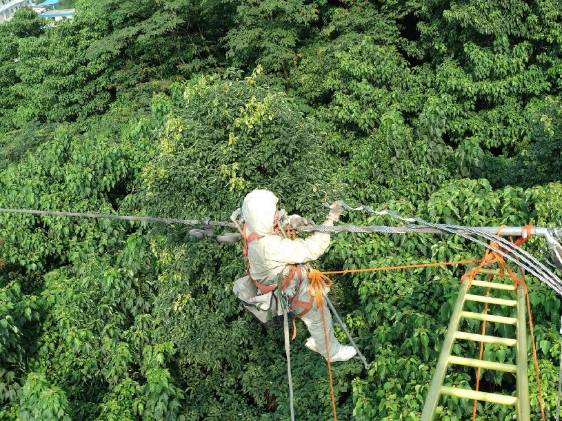 第一次爬塔時(shí),田貴陽(yáng)心里直打怵?!坝?xùn)練的時(shí)候,師傅教我們不要往下看,往上看,看著腳釘往上爬?!爆F(xiàn)在,工作12年的他早已輕車熟路,120米高的過(guò)江塔,蹭蹭蹭六七分鐘就爬了上去。而上了塔工作才剛開(kāi)始,要是碰上任務(wù)多,在半空一待就得五六個(gè)小時(shí)。