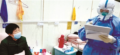 圖為朱斌(右)在武漢體校方艙醫(yī)院查房。