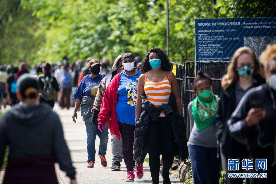 5月3日,在美國(guó)紐約,人們?cè)谝粋€(gè)發(fā)放點(diǎn)排隊(duì)領(lǐng)取口罩。 新華社發(fā)(郭克攝)