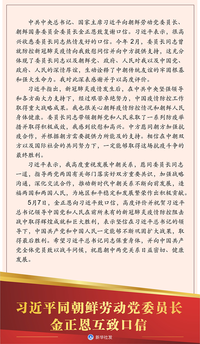 5月7日,金正恩向習近平致口信,高度評價并祝賀習近平總書記領(lǐng)導中國黨和人民在前所未有的新冠肺炎疫情防控阻擊戰(zhàn)中取得輝煌成就和巨大勝利,表示堅信在習近平總書記的領(lǐng)導下,中國共產(chǎn)黨和中國人民一定能夠不斷鞏固擴大戰(zhàn)果,取得最后勝利。希望習近平總書記同志保重身體,并向中國共產(chǎn)黨全體黨員致以戰(zhàn)斗問候,祝愿朝中兩黨關(guān)系日益密切、健康發(fā)展。