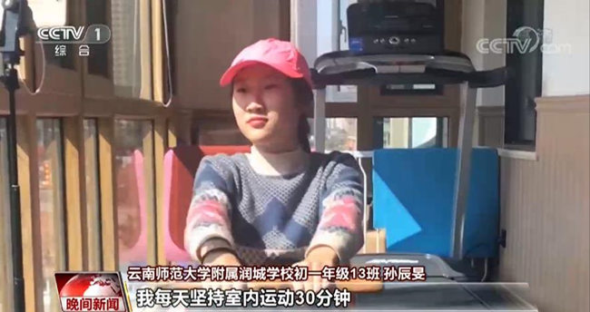 云南師范大學(xué)附屬潤城學(xué)校初一年級13班 孫辰旻:在爸爸的陪伴下,我每天堅持室內(nèi)運(yùn)動30分鐘,室外運(yùn)動1小時。體育運(yùn)動不僅能提升我的身體素質(zhì),還能不斷磨練我的意志,增強(qiáng)我的自信。