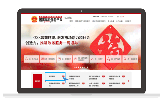 你可以通過電腦使用網(wǎng)頁搜索找到“國家政務服務平臺”后,首頁點擊“百日招聘”進入訪問,也可以點擊下方圖片直達“百日招聘”專題。