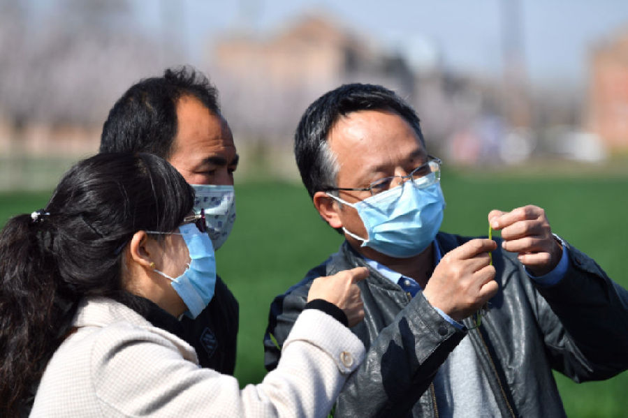 農(nóng)業(yè)科技特派員觀察小麥長(zhǎng)勢(shì) 張博文 攝