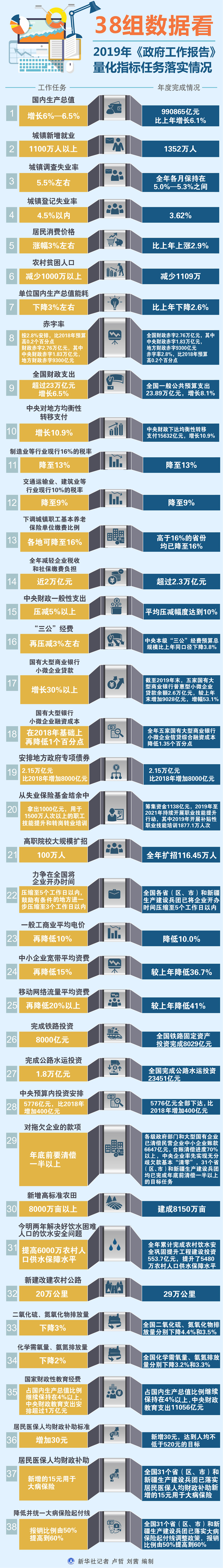 新華社北京5月19日電(記者高亢)全國(guó)兩會(huì)召開(kāi)在即,國(guó)務(wù)院19日對(duì)外公布2019年《政府工作報(bào)告》量化指標(biāo)任務(wù)落實(shí)情況表,38項(xiàng)指標(biāo)任務(wù)均已完成。