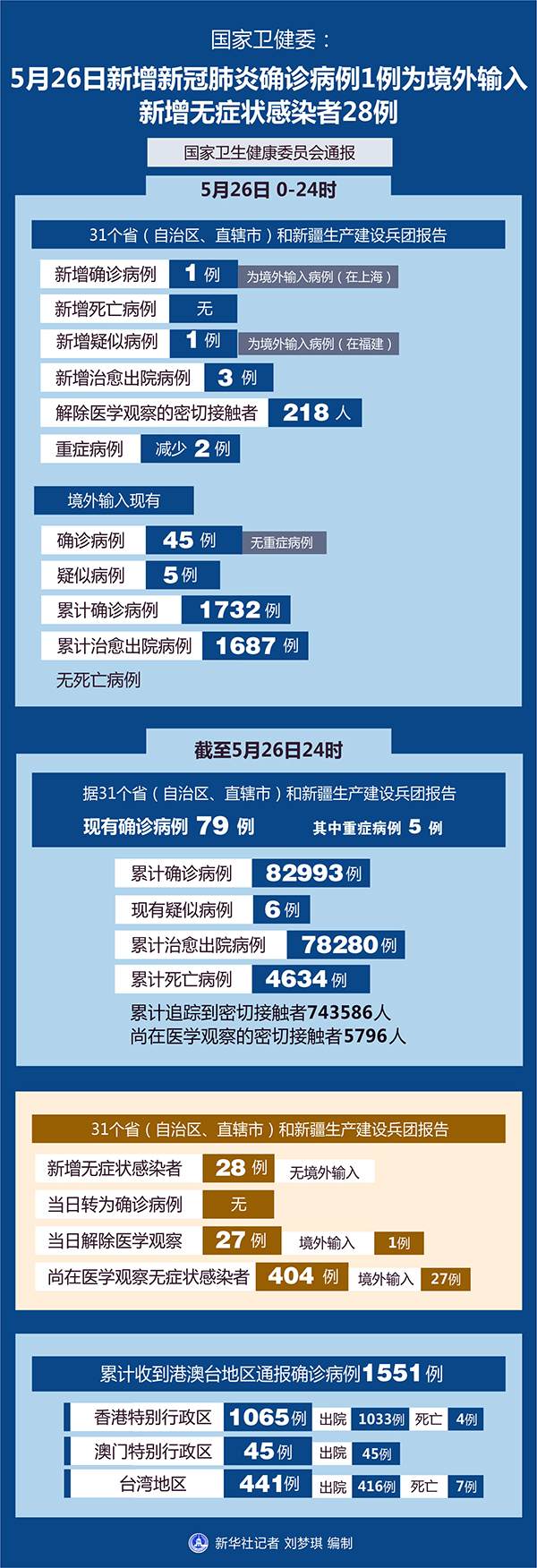 截至5月26日24時(shí),據(jù)31個(gè)?。ㄗ灾螀^(qū)、直轄市)和新疆生產(chǎn)建設(shè)兵團(tuán)報(bào)告,現(xiàn)有確診病例79例(其中重癥病例5例),累計(jì)治愈出院病例78280例,累計(jì)死亡病例4634例,累計(jì)報(bào)告確診病例82993例,現(xiàn)有疑似病例6例。累計(jì)追蹤到密切接觸者743586人,尚在醫(yī)學(xué)觀察的密切接觸者5796人。