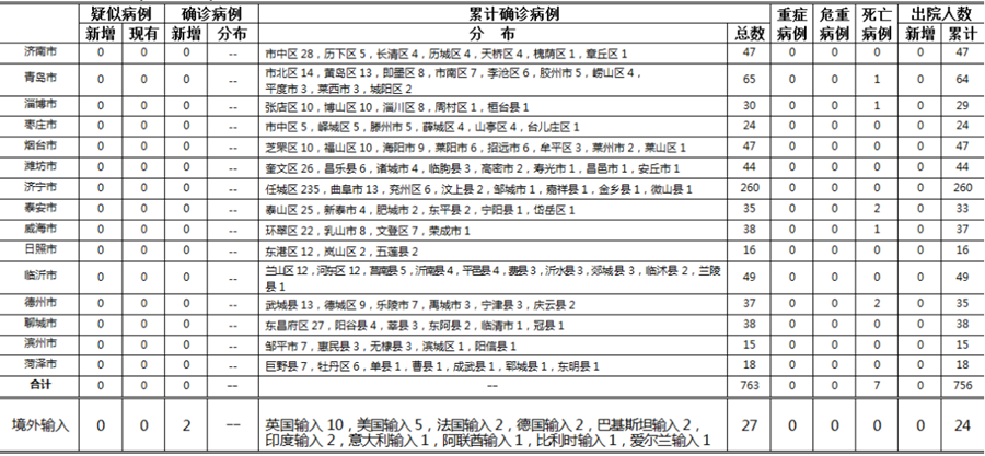 山東無本地住院疑似病例、確診病例。累計報告確診病例763例,死亡7例,治愈出院756例。