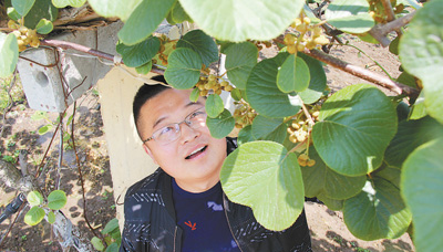 姚力在觀察獼猴桃花蕾長勢。本報(bào)記者 原韜雄攝
