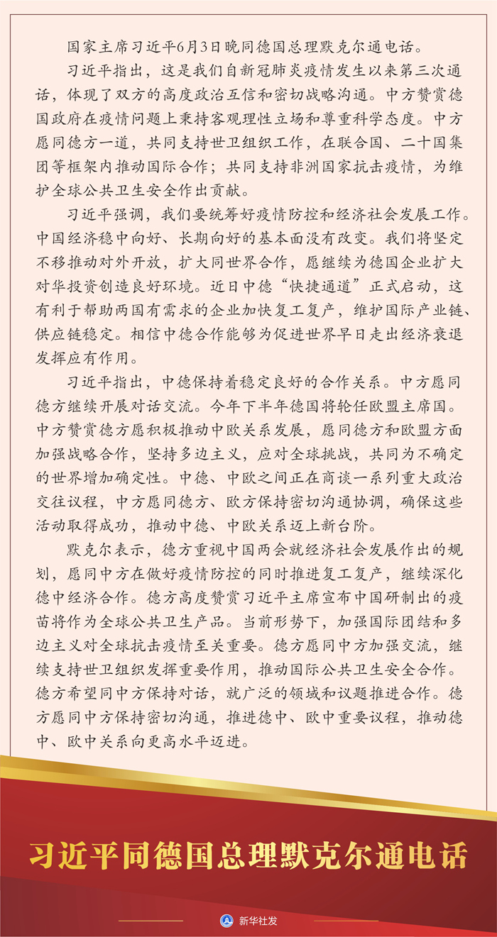 新華社北京6月3日電? 國家主席習近平6月3日晚同德國總理默克爾通電話。