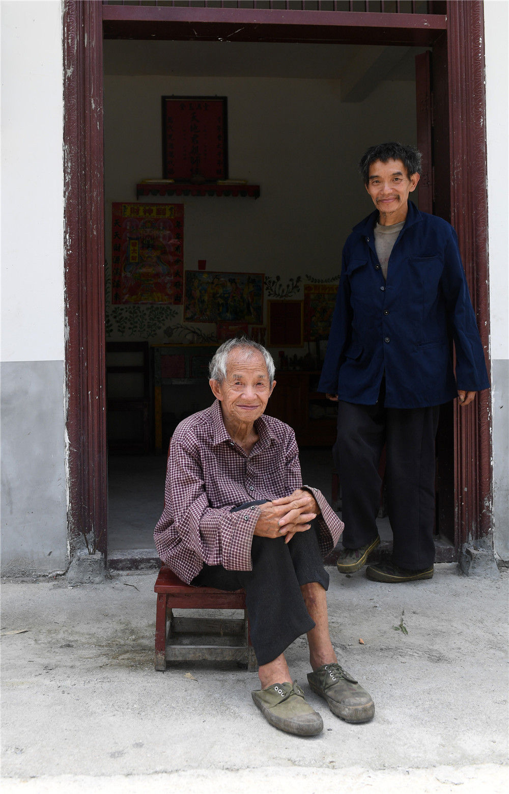 在廣西環(huán)江毛南族自治縣下南鄉(xiāng)下塘村上眉屯,譚廣田(右)和父親譚運(yùn)日在家門口(5月23日攝)。新華社記者 陸波岸 攝