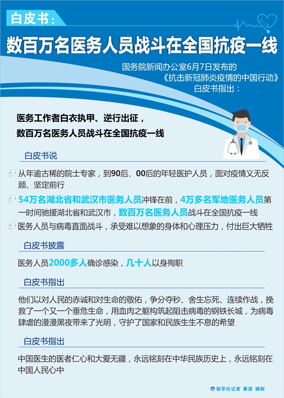 新華社北京6月7日電(記者田曉航)國務(wù)院新聞辦公室7日發(fā)布的《抗擊新冠肺炎疫情的中國行動》白皮書指出,醫(yī)務(wù)工作者白衣執(zhí)甲、逆行出征,數(shù)百萬名醫(yī)務(wù)人員戰(zhàn)斗在全國抗疫一線。