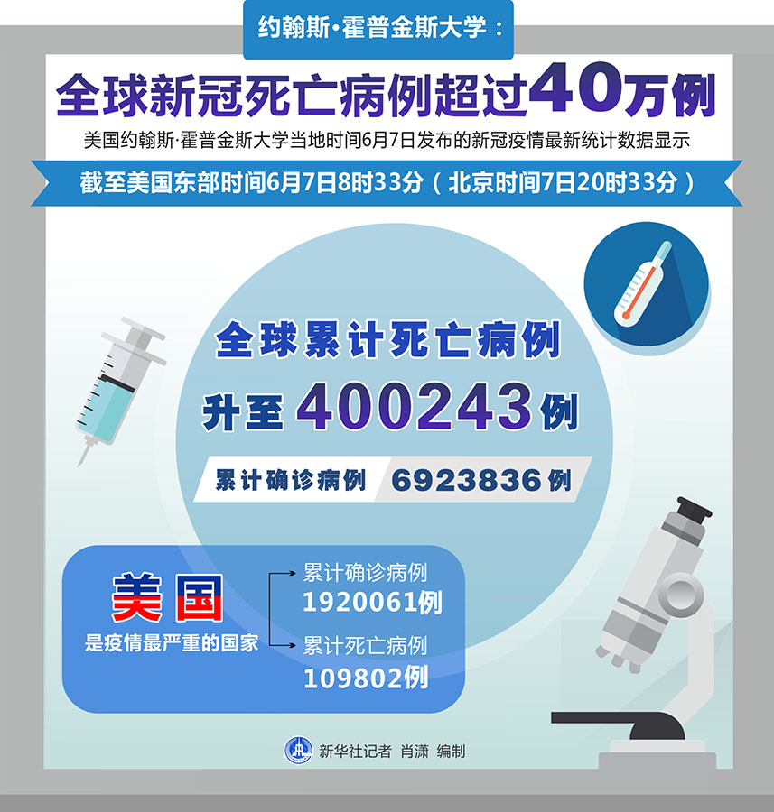 新華社紐約6月7日電 美國約翰斯·霍普金斯大學(xué)7日發(fā)布的新冠疫情最新統(tǒng)計數(shù)據(jù)顯示,全球累計死亡病例超過40萬例。