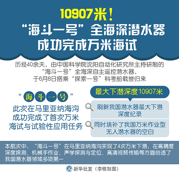 “海斗一號(hào)”此次在馬里亞納海溝成功完成了首次萬米海試與試驗(yàn)性應(yīng)用任務(wù),最大下潛深度10907米,刷新我國潛水器最大下潛深度紀(jì)錄,同時(shí)填補(bǔ)了我國萬米作業(yè)型無人潛水器的空白。