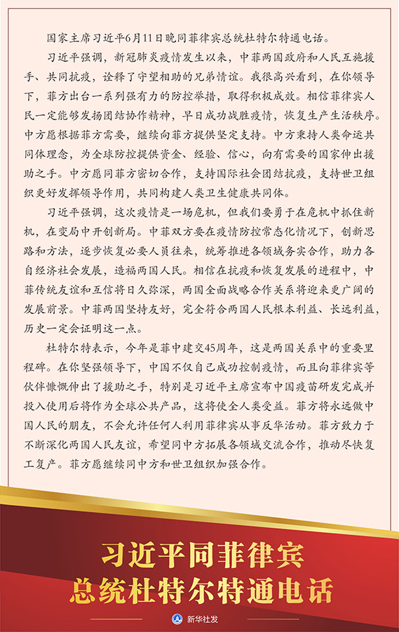 新華社北京6月11日電 國家主席習(xí)近平6月11日晚同菲律賓總統(tǒng)杜特爾特通電話。