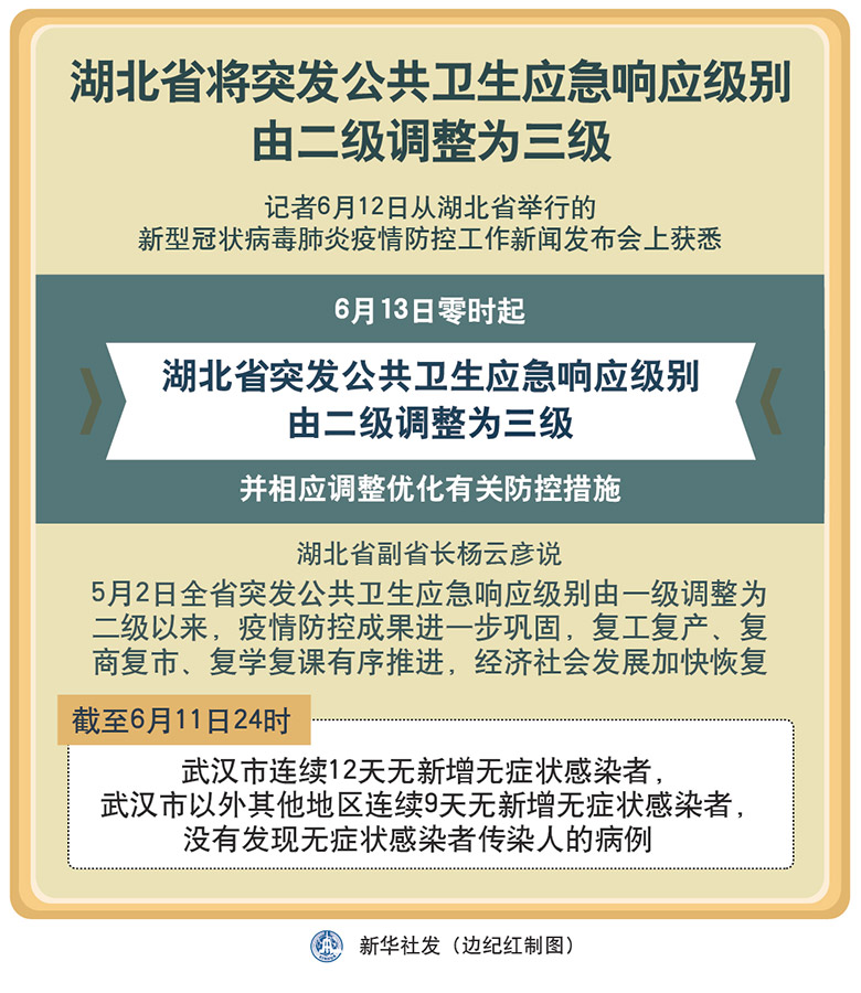 新華社武漢6月12日電(記者李偉、樂文婉)記者12日從湖北省舉行的新型冠狀病毒肺炎疫情防控工作新聞發(fā)布會上獲悉,6月13日零時起,湖北省突發(fā)公共衛(wèi)生應急響應級別由二級調(diào)整為三級,并相應調(diào)整優(yōu)化有關防控措施。