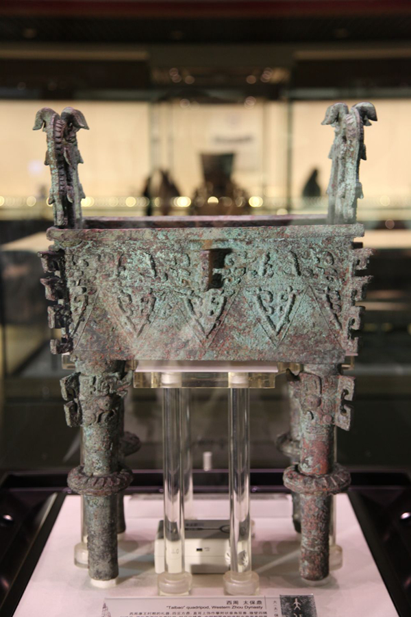“從形制大小來(lái)看,有別于三足圓鼎,這件四足方鼎應(yīng)該是西周早期貴族所用的器物。方鼎高50.7厘米、口徑23.36厘米、重26公斤。方鼎的腹部?jī)?nèi)壁上清晰地鑄有‘大保鑄’三字銘文。據(jù)考證,這‘大保’二字其實(shí)應(yīng)該為‘太?!?,因此這件方鼎被稱作太保鼎?!标愖空f(shuō)。