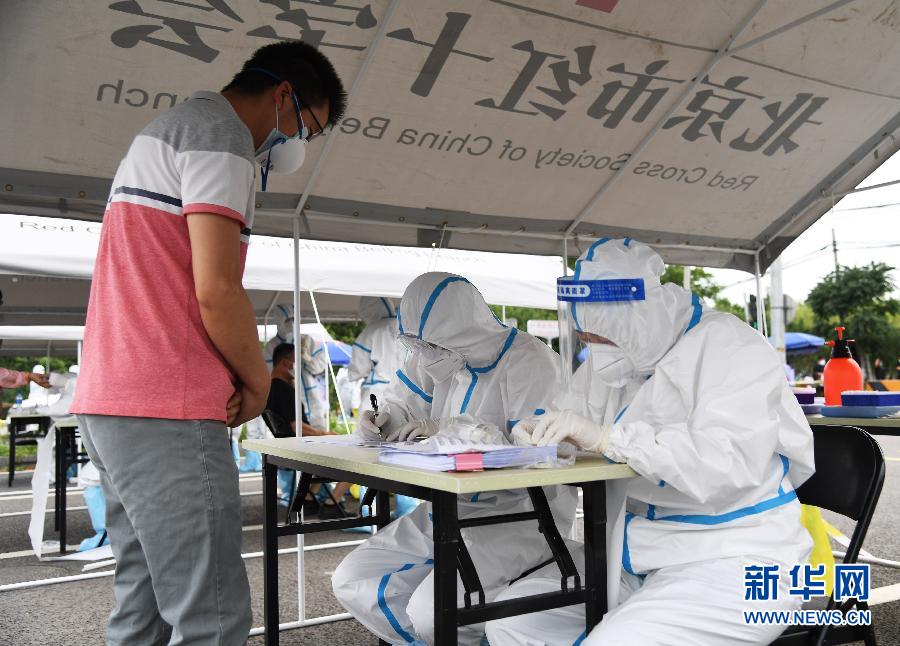 6月15日,在位于北京市豐臺(tái)區(qū)新村街道的一處臨時(shí)核酸采樣點(diǎn),工作人員在為進(jìn)行核酸檢測(cè)的人員(左一)登記。 新華社記者 任超 攝