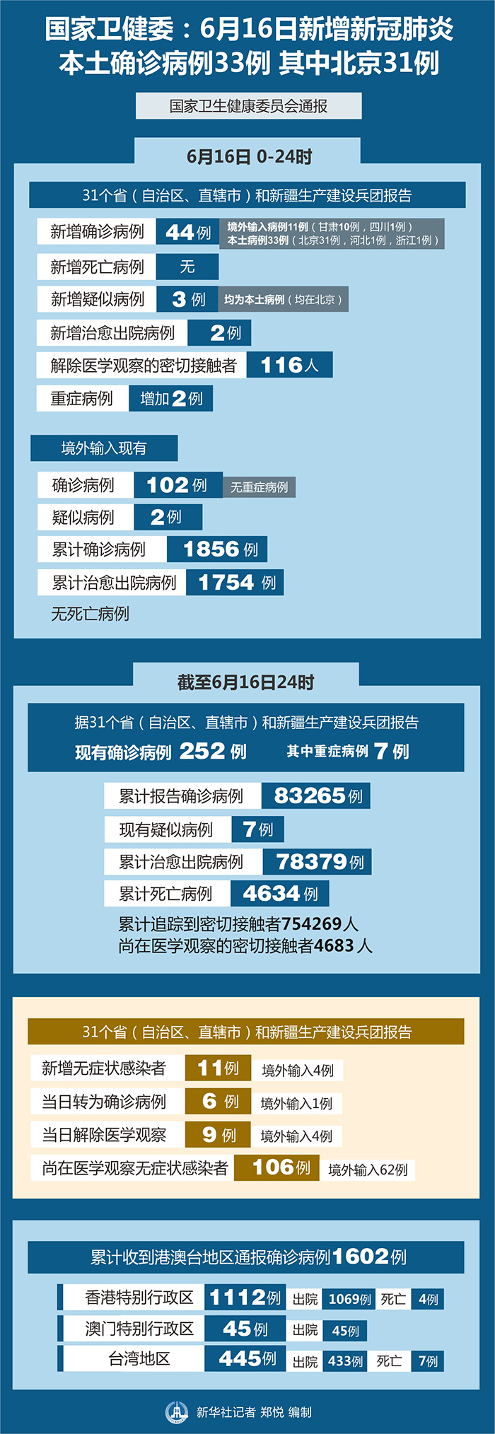 截至6月16日24時(shí),據(jù)31個(gè)?。ㄗ灾螀^(qū)、直轄市)和新疆生產(chǎn)建設(shè)兵團(tuán)報(bào)告,現(xiàn)有確診病例252例(其中重癥病例7例),累計(jì)治愈出院病例78379例,累計(jì)死亡病例4634例,累計(jì)報(bào)告確診病例83265例,現(xiàn)有疑似病例7例。累計(jì)追蹤到密切接觸者754269人,尚在醫(yī)學(xué)觀(guān)察的密切接觸者4683人。