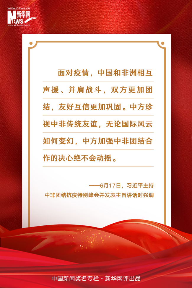 新老朋友通過視頻相聚,共商團(tuán)結(jié)抗疫大計(jì),共敘中非兄弟情誼。6月17日,由中國(guó)和非洲聯(lián)盟輪值主席國(guó)南非、中非合作論壇共同主席國(guó)塞內(nèi)加爾共同發(fā)起的中非團(tuán)結(jié)抗疫特別峰會(huì)舉行。國(guó)家主席習(xí)近平在北京主持了這一峰會(huì),并發(fā)表題為《團(tuán)結(jié)抗疫 共克時(shí)艱》的主旨講話,強(qiáng)調(diào)中非要堅(jiān)定不移攜手抗擊疫情、推進(jìn)中非合作、踐行多邊主義、推進(jìn)中非友好,共同打造中非衛(wèi)生健康共同體,推進(jìn)中非全面戰(zhàn)略合作伙伴關(guān)系高水平發(fā)展。