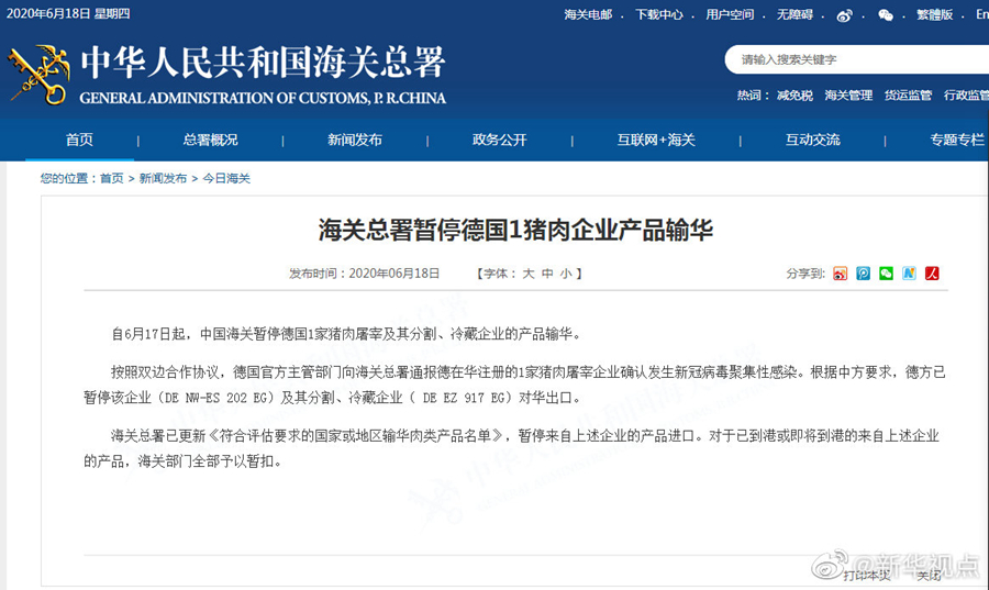 海關(guān)總署18日發(fā)布公告,自6月17日起,中國海關(guān)暫停德國一家豬肉屠宰及其分割、冷藏企業(yè)的產(chǎn)品輸華。按照雙邊合作協(xié)議,德國官方主管部門向海關(guān)總署通報(bào)德在華注冊(cè)的一家豬肉屠宰企業(yè)確認(rèn)發(fā)生新冠病毒聚集性感染。根據(jù)中方要求,德方已暫停該企業(yè)及其分割、冷藏企業(yè)對(duì)華出口。海關(guān)總署已更新《符合評(píng)估要求的國家或地區(qū)輸華肉類產(chǎn)品名單》,暫停來自上述企業(yè)的產(chǎn)品進(jìn)口。對(duì)于已到港或即將到港的來自上述企業(yè)的產(chǎn)品,海關(guān)部門全部予以暫扣。(記者劉紅霞)