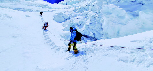 5月9日,陳剛等人從6500米營(yíng)地前往7028米營(yíng)地,攀登大冰壁途中。中國(guó)地質(zhì)大學(xué)(武漢)供圖