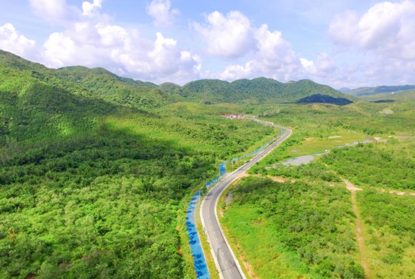 深圳市深汕特別合作區(qū)正在打造中的集“山道、河道、濱海棧道”于一體的圳美綠道鳥瞰圖。
