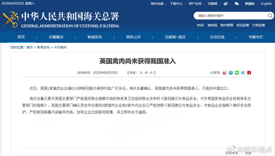 海關(guān)總署20日發(fā)布公告說,近日英國一家禽肉企業(yè)確診58例新冠肺炎病例引起廣泛關(guān)注。海關(guān)總署確認(rèn),英國禽肉尚未獲得我國準(zhǔn)入,不能向中國出口。海關(guān)總署已要求英國主管部門嚴(yán)格落實(shí)聯(lián)合國糧農(nóng)組織和世界衛(wèi)生組織聯(lián)合發(fā)布的《新冠肺炎與食品安全:對負(fù)責(zé)國家食品安全控制體系主管部門的指南》。英國主管部門確認(rèn)其在華注冊的8家豬肉企業(yè)和2家牛肉企業(yè)已嚴(yán)格按照《新冠肺炎與食品安全:對食品企業(yè)指南》做好安全防護(hù),嚴(yán)防新冠病毒污染輸華肉類;如有企業(yè)出現(xiàn)新冠疫情,將立即向中方通報。(記者劉紅霞)