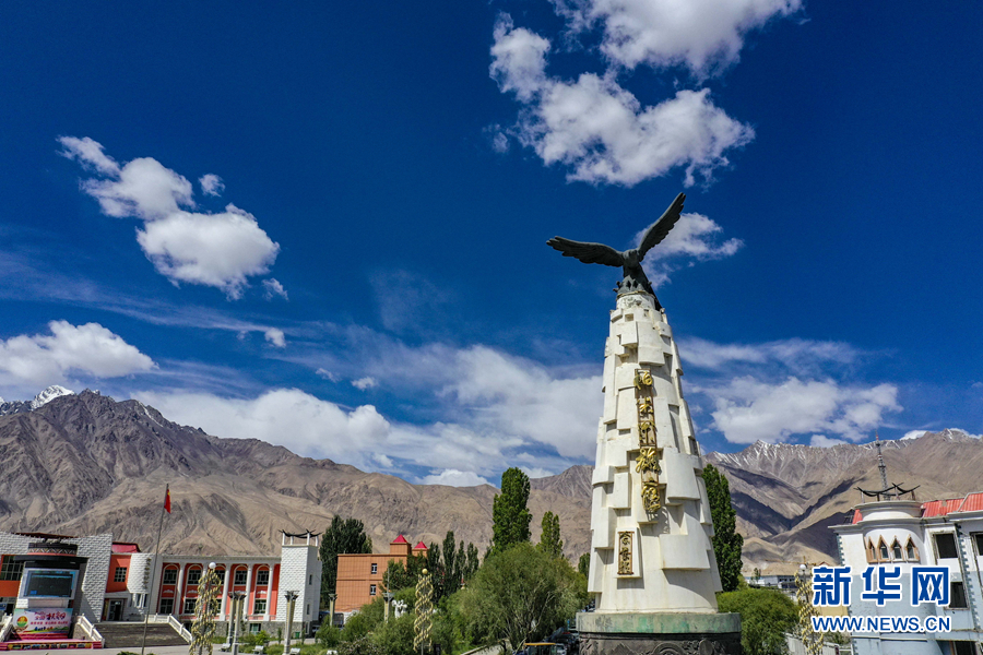 這是位于新疆塔什庫爾干塔吉克自治縣縣城的“帕米爾雄鷹”雕塑(6月20日攝,無人機(jī)照片)。新華社記者 胡虎虎 攝