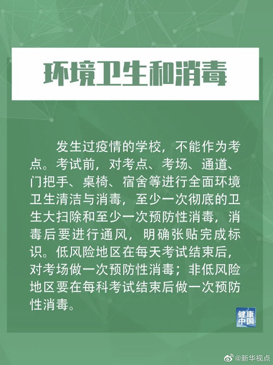 措施提到,發(fā)生過疫情的學(xué)校,不能作為考點。低風(fēng)險地區(qū)在每天考試結(jié)束后,對考場做一次預(yù)防性消毒;非低風(fēng)險地區(qū)要在每科考試結(jié)束后做一次預(yù)防性消毒。