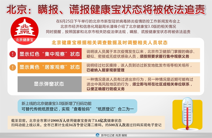 新華社北京6月25日電(記者魯暢)在25日下午舉行的北京市新型冠狀病毒肺炎疫情防控工作新聞發(fā)布會(huì)上,北京市經(jīng)濟(jì)和信息化局副局長潘鋒介紹了北京健康寶3.0版的相關(guān)情況,同時(shí)提醒,按照國家和北京市相關(guān)防疫法律法規(guī),瞞報(bào)、謊報(bào)健康寶狀態(tài)將被依法追責(zé)。