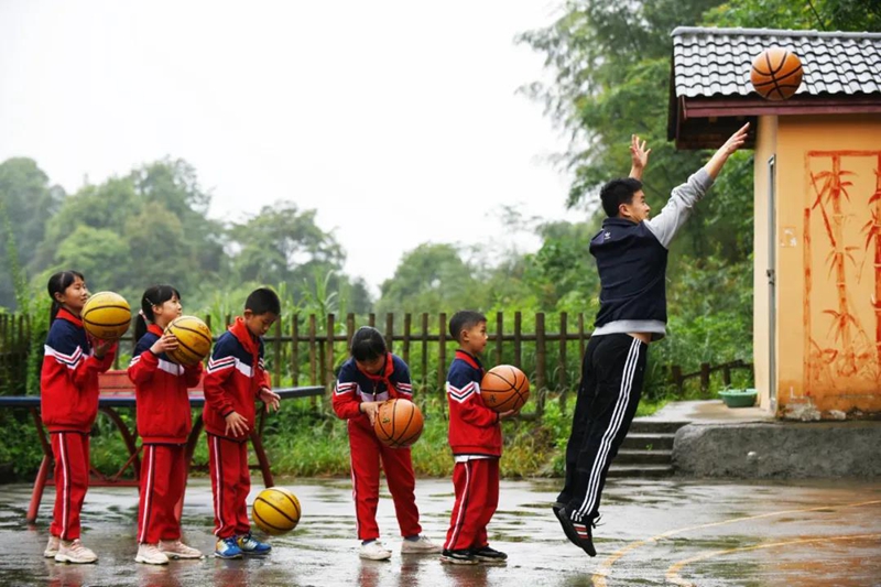 貴州一特崗教師與學(xué)生在體育課上練習(xí)投籃 楊文斌 攝