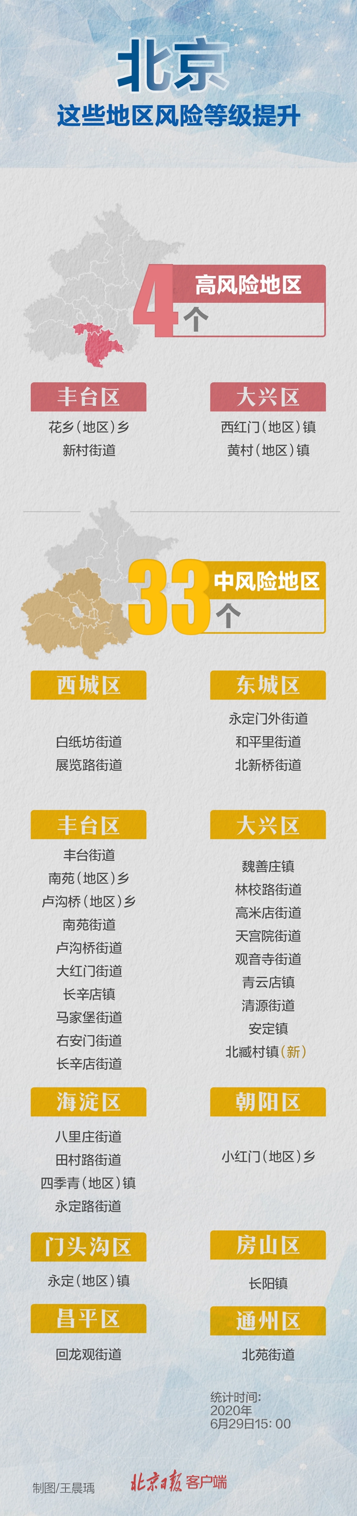 截至目前,本市已有33個中風險地區(qū),涉及豐臺區(qū)、大興區(qū)、海淀區(qū)、西城區(qū)、房山區(qū)、東城區(qū)、朝陽區(qū)、門頭溝區(qū)、通州區(qū)、昌平區(qū)10個區(qū)。另有4個高風險地區(qū),分別位于豐臺區(qū)、大興區(qū)。