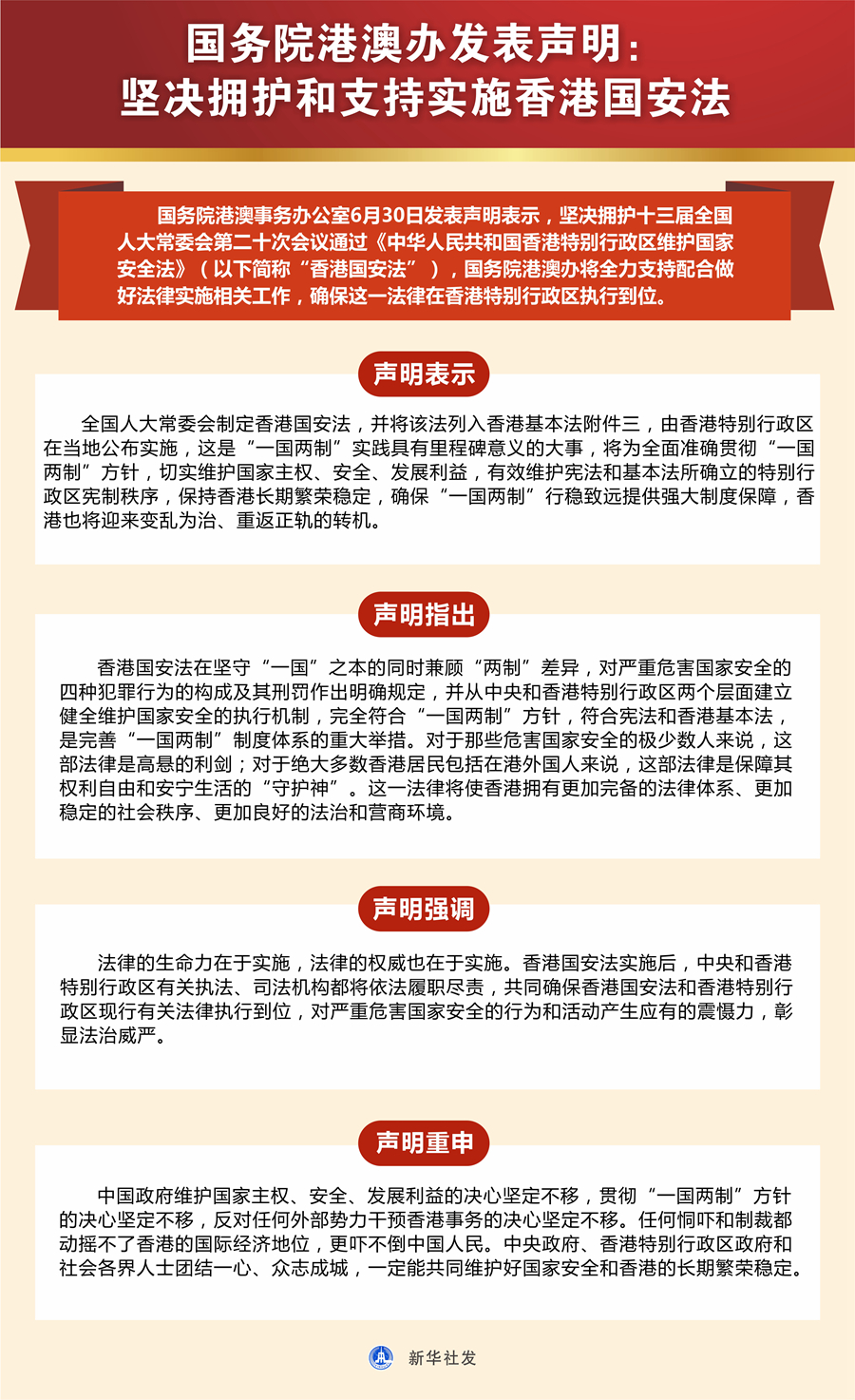 新華社北京6月30日電 國務院港澳事務辦公室30日發(fā)表聲明表示,堅決擁護十三屆全國人大常委會第二十次會議通過《中華人民共和國香港特別行政區(qū)維護國家安全法》(以下簡稱“香港國安法”),國務院港澳辦將全力支持配合做好法律實施相關工作,確保這一法律在香港特別行政區(qū)執(zhí)行到位。