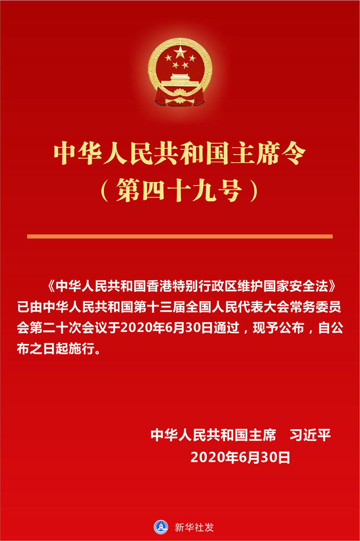 《中華人民共和國香港特別行政區(qū)維護國家安全法》已由中華人民共和國第十三屆全國人民代表大會常務委員會第二十次會議于2020年6月30日通過,現(xiàn)予公布,自公布之日起施行。