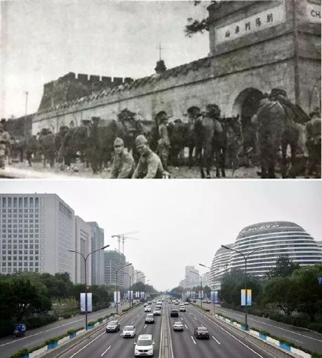 上圖為1937年8月8日,日本騎兵在朝陽(yáng)門車站集結(jié)(資料照片);下圖為2017年7月3日拍攝的朝陽(yáng)門地區(qū)(新華社記者 張晨霖 攝)。