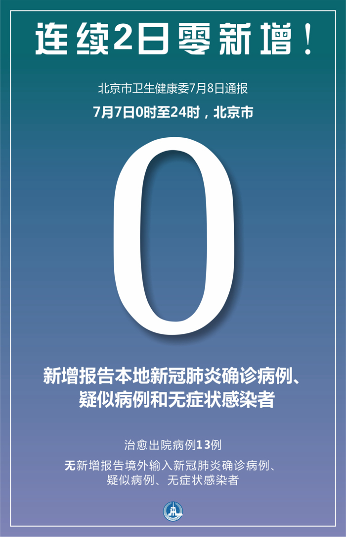新華社北京7月8日電(記者俠克)北京市衛(wèi)生健康委8日通報(bào),7月7日0時(shí)至24時(shí),北京市無(wú)新增報(bào)告本地新冠肺炎確診病例、疑似病例和無(wú)癥狀感染者,治愈出院病例13例;無(wú)新增報(bào)告境外輸入新冠肺炎確診病例、疑似病例、無(wú)癥狀感染者。北京市連續(xù)2日無(wú)新增確診病例。