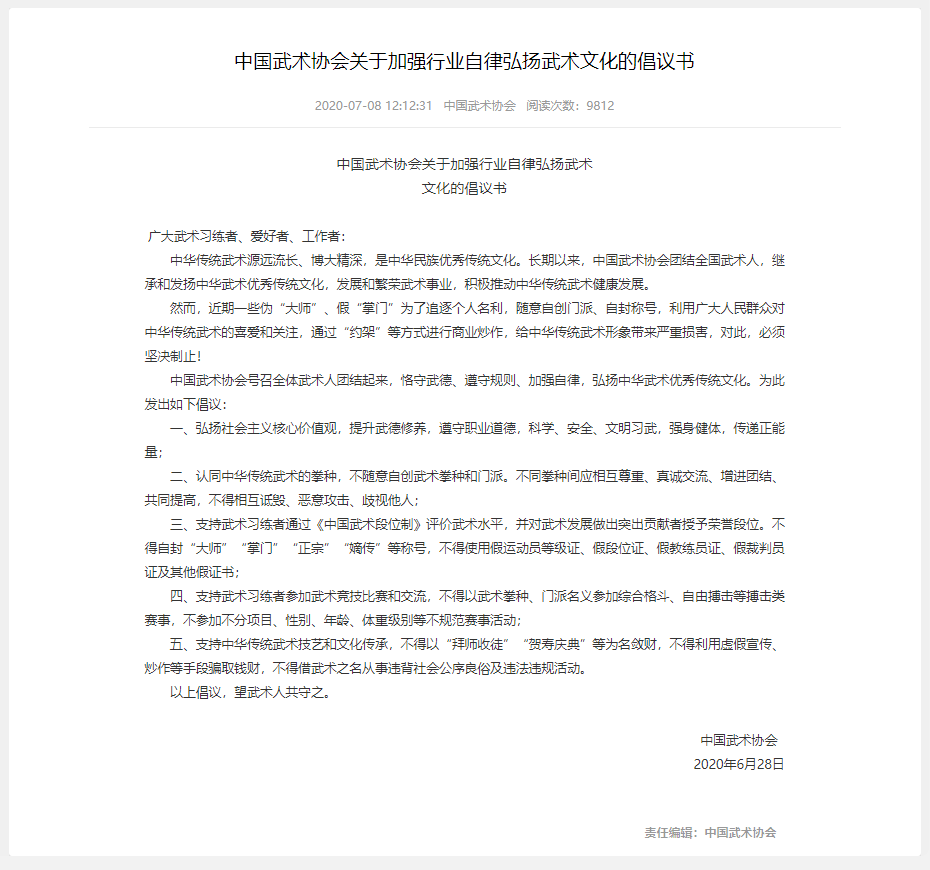 中國(guó)武術(shù)協(xié)會(huì)在其網(wǎng)站發(fā)布《關(guān)于加強(qiáng)行業(yè)自律弘揚(yáng)武術(shù)文化的倡議書(shū)》,號(hào)召全體武術(shù)人團(tuán)結(jié)起來(lái),恪守武德、遵守規(guī)則、加強(qiáng)自律,弘揚(yáng)中華武術(shù)優(yōu)秀傳統(tǒng)文化,并倡議武術(shù)習(xí)練者不得自封“大師”“掌門”“正宗”“嫡傳”等稱號(hào),不得以武術(shù)拳種、門派名義參加綜合格斗、自由搏擊等搏擊類賽事,不參加不分項(xiàng)目、性別、年齡、體重級(jí)別等不規(guī)范賽事活動(dòng)。