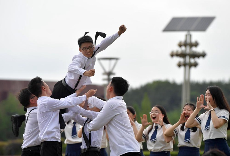 在南昌大學(xué)校園內(nèi),學(xué)子們一起歡呼,拍畢業(yè)照留念(6月10日攝)。新華社記者彭昭之?dāng)z