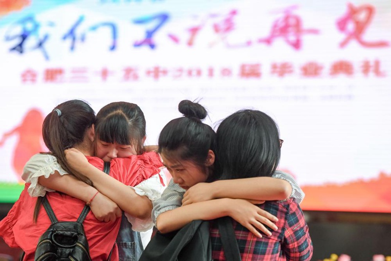 6月9日,合肥市第三十五中學(xué)的高三畢業(yè)生在畢業(yè)典禮上與老師擁抱。新華社記者張端攝