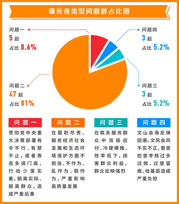 從具體問(wèn)題類型看,“貫徹黨中央重大決策部署有令不行、有禁不止,或者表態(tài)多調(diào)門高、行動(dòng)少落實(shí)差,脫離實(shí)際、脫離群眾,造成嚴(yán)重后果”方面問(wèn)題5起,占比8.6%;“在履職盡責(zé)、服務(wù)經(jīng)濟(jì)社會(huì)發(fā)展和生態(tài)環(huán)境保護(hù)方面不擔(dān)當(dāng)、不作為、亂作為、假作為,嚴(yán)重影響高質(zhì)量發(fā)展”方面問(wèn)題47起,占比81%;“在聯(lián)系服務(wù)群眾中消極應(yīng)付、冷硬橫推、效率低下,損害群眾利益,群眾反映強(qiáng)烈”方面問(wèn)題3起,占比5.2%;“文山會(huì)海反彈回潮,文風(fēng)會(huì)風(fēng)不實(shí)不正,督查檢查考核過(guò)多過(guò)頻、過(guò)度留痕,給基層造成嚴(yán)重負(fù)擔(dān)”方面問(wèn)題3起,占比5.2%。