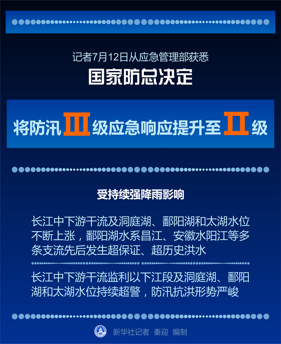 新華社北京7月12日電(記者劉夏村)記者12日從應(yīng)急管理部獲悉,當(dāng)日,國家防總決定將防汛Ⅲ級應(yīng)急響應(yīng)提升至Ⅱ級。國家防總、應(yīng)急管理部派出由部級領(lǐng)導(dǎo)帶隊(duì)的工作組和專家組趕赴江西等地指導(dǎo)防汛救災(zāi)工作。