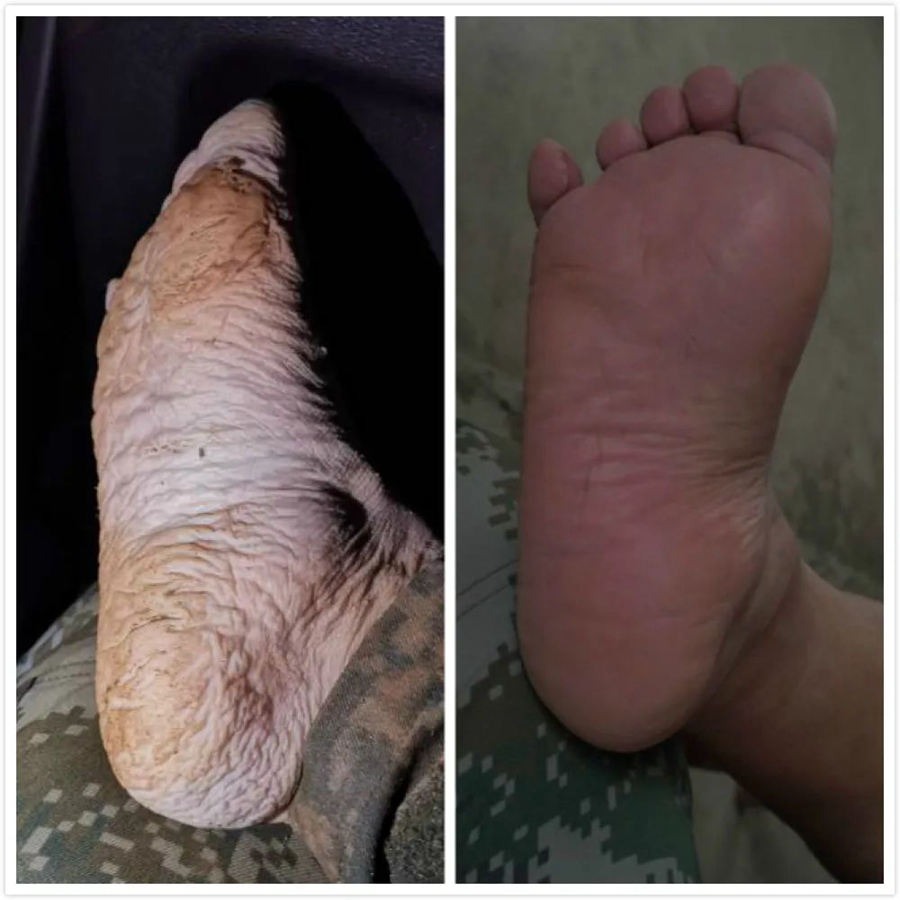 東至縣人武部部長南小勇回憶,在回來的路上,由于大家身上的衣服都沾滿了泥漿,眾人就把衣服脫了下來坐車返回。大家的目光一下子就集中在陳壽春的腳上,南小勇拍下了照片,發(fā)到了工作群里,引發(fā)第一波“心疼”。