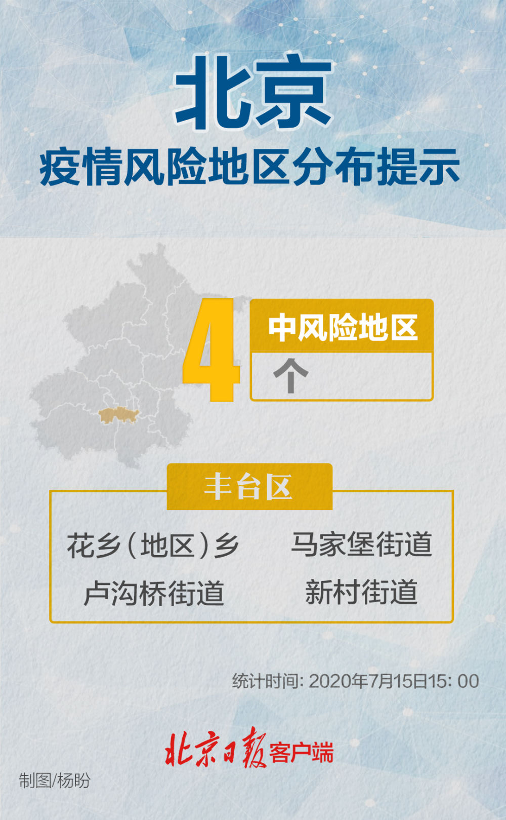 今天下午,在北京市新型冠狀病毒肺炎疫情防控工作第152場(chǎng)新聞發(fā)布會(huì)上,市疾控中心副主任龐星火介紹,7月14日0時(shí)至24時(shí),北京無(wú)新增報(bào)告確診病例。經(jīng)評(píng)估,大興區(qū)青云店鎮(zhèn)、西紅門鎮(zhèn)、興豐街道連續(xù)14天內(nèi)無(wú)新增本地確診病例,由中風(fēng)險(xiǎn)地區(qū)調(diào)整為低風(fēng)險(xiǎn)地區(qū)。截至目前,北京市共有中風(fēng)險(xiǎn)地區(qū)4個(gè),為豐臺(tái)區(qū)花鄉(xiāng)鄉(xiāng)、盧溝橋街道、馬家堡街道、新村街道。豐臺(tái)區(qū)其余街道為低風(fēng)險(xiǎn)地區(qū)。