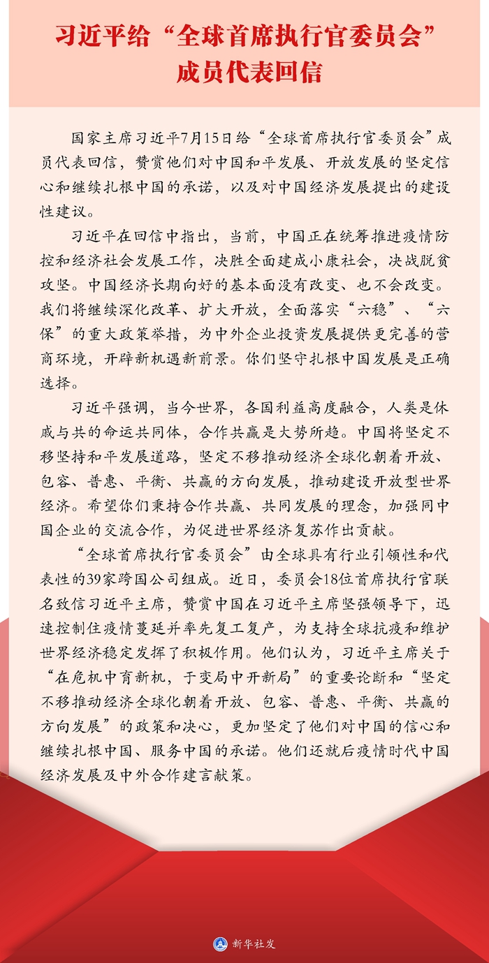 新華社北京7月16日電 國(guó)家主席習(xí)近平7月15日給“全球首席執(zhí)行官委員會(huì)”成員代表回信,贊賞他們對(duì)中國(guó)和平發(fā)展、開放發(fā)展的堅(jiān)定信心和繼續(xù)扎根中國(guó)的承諾,以及對(duì)中國(guó)經(jīng)濟(jì)發(fā)展提出的建設(shè)性建議。