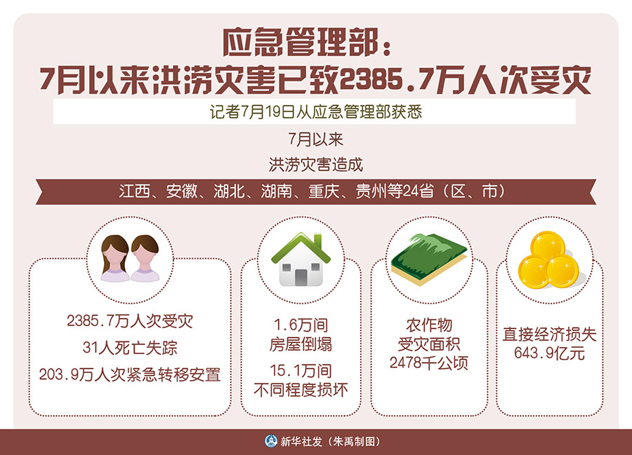 新華社北京7月19日電(記者魏玉坤)記者19日從應急管理部獲悉,7月以來,洪澇災害造成江西、安徽、湖北、湖南、重慶、貴州等24省(區(qū)、市)2385.7萬人次受災,31人死亡失蹤,203.9萬人次緊急轉移安置。