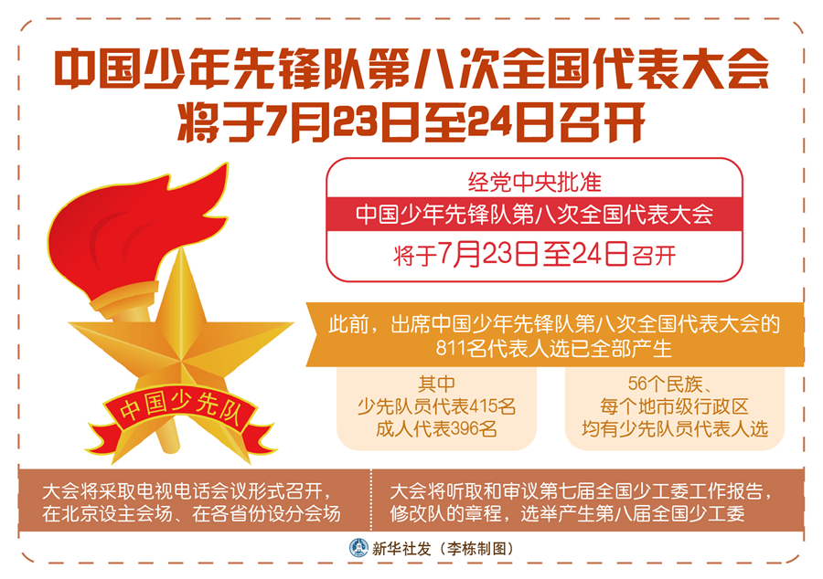 新華社北京7月20日電(記者王鵬)經(jīng)黨中央批準,中國少年先鋒隊第八次全國代表大會將于7月23日至24日召開。目前,大會的各項籌備工作進展順利。