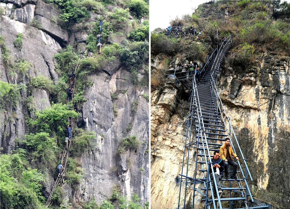 拼版照片:左圖為通往四川涼山彝族自治州昭覺縣阿土列爾村的簡易藤梯(2016年5月14日攝);右圖為改建后的鋼梯(2017年12月5日攝)。新華社發(fā)(阿克鳩射 攝)
